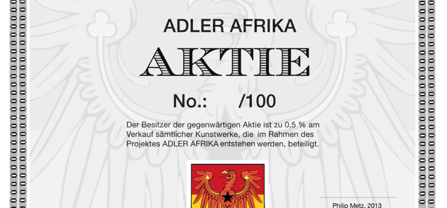 Die "ADLER AFRIKA-Aktie" kostet 500 Euro. Sie existiert in einer limitierten Auflage von 100 Stck. .Jede einzelne Aktie ist numeriert und handsigniert.